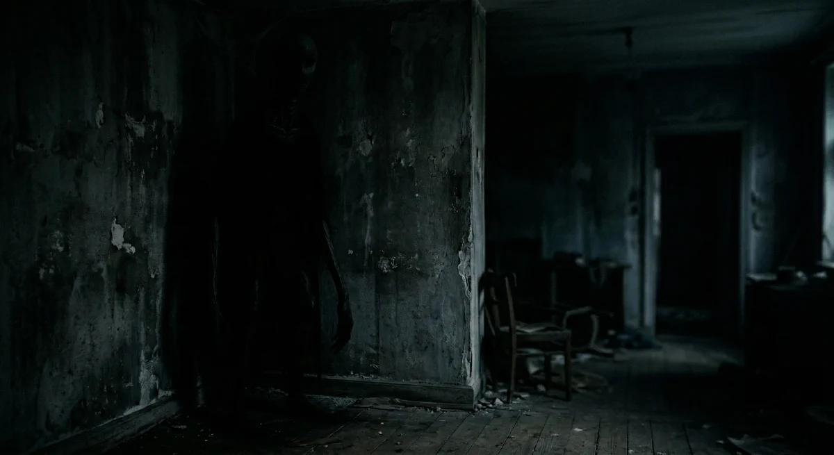 It was tall. It filled the frame from the threshold to the header, and it was narrow, narrower than a person, and it was dark in a way that wasn’t shadow, in a way that had depth and texture, and it stood in the doorway to the hall the way something stands when it has been standing there for a very long time, with a patience that had nothing to do with waiting because waiting implies an end and this was just presence, motionless and absolute.